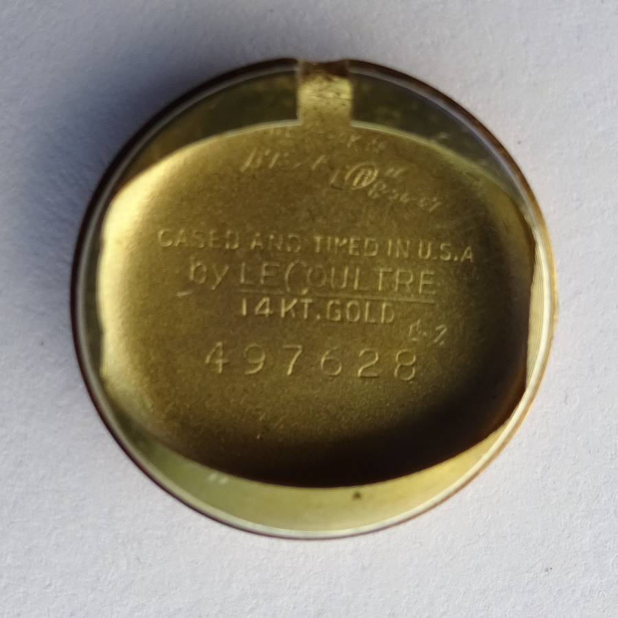 The case appears to be solid 14K yellow gold. Inside it is inscribed "CASED AND TIMED IN USA by LECOULTRE" and "14K.GOLD" and the number 497628. The outside has "14K GOLD APEX".