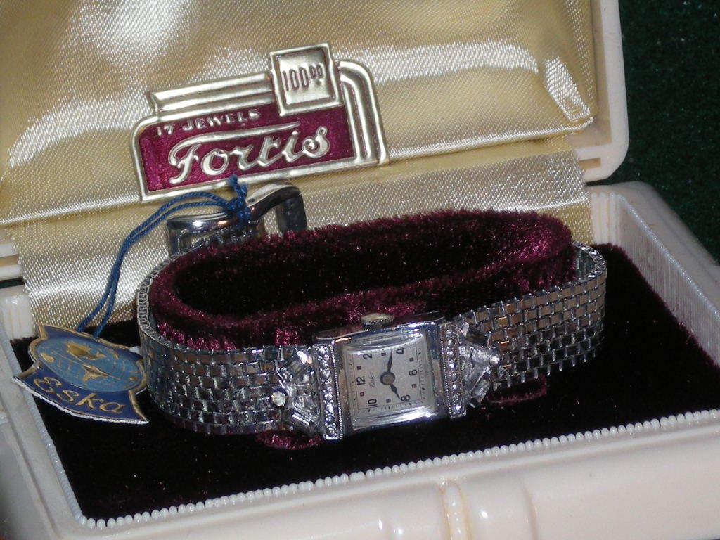 Below are some photos of a vintage Eska watch I recently acquired. I have had it serviced and it's running well. It came with the tag attached and is apparently "new old stock". I'm interested in knowing when it was made (approximate) and a value (approximate) for it. The jeweler who serviced it thinks it's from the 20's or 30's based on the curved crystal and style. I believe the case and band are stainless with rhinestones around the face and on the buckle, a few of them are dark because the foil back has deteriorated but they are all there. There are no marks on the case or the back.