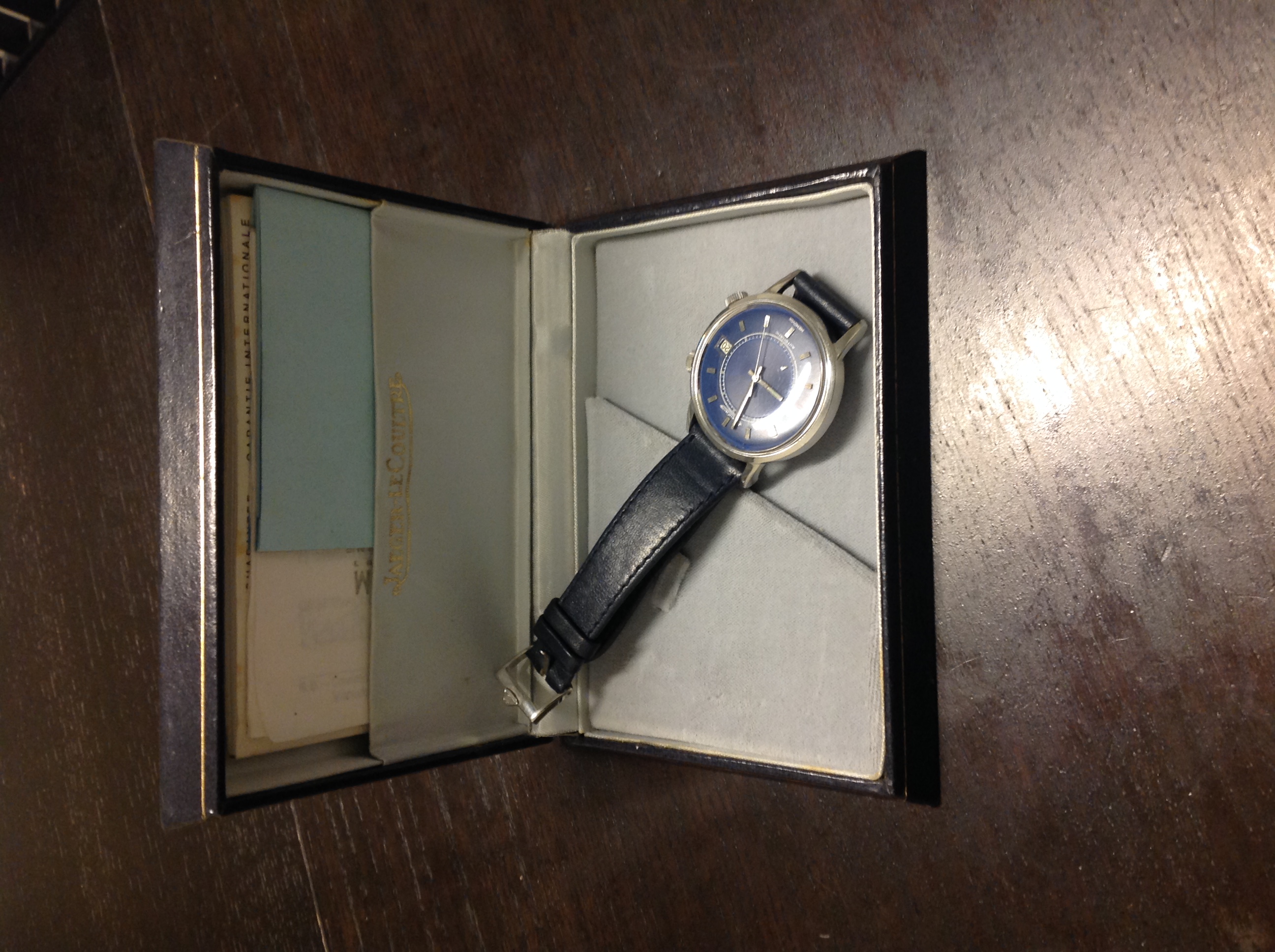 Blue dials outter and inner , second hand seems white (not sure if original). Two things that I am concerned about, I am not sure if it is far on the bottom, but there is no 'Swiss' or 'Swiss Made' written. I went to my local watch maker, who deals with vintage JLC and he opened the back and the movement is LeCoultre (unfortunately no pictures). I mentioned this to him and he said (in Swiss-German) something to extent of Jaeger & LeCoultre were separate but may have did different parts of a watch. I have read that the the text should match JLC dial, crowns, movement. Watch runs and keeps time (power reserve about 25-30 hours i guess) alarm works,not sure last time it was serviced. What do you think this may go for?