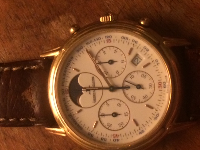 I think it's called the "jaeger lecoultre odysseus chronograph moon phase" do a google search on that to see if that's what it is, and some pricing will pop up. Thanks.