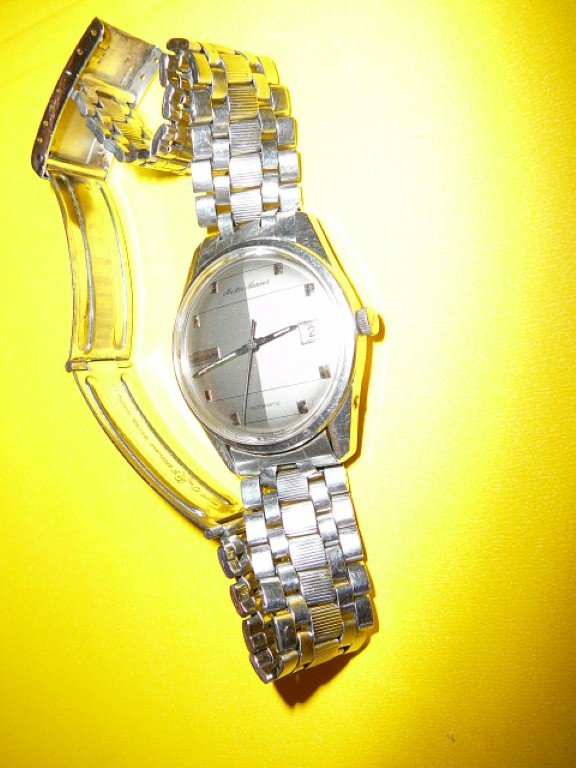 Made in the 1960s. Center-seconds, self-winding, water-resistant, stainless steel wristwatch with date. Model E557/1.