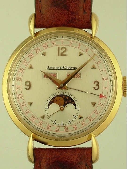I recently saw the following JLC Triple Date Moonphase offered for sale in Switzerland. Is this one that was cased and sold by JLC in the 1990s with the movements they still had on hand? The reference numbers on the back of the case do not look like the ones I'm accustomed to from the 40s and 50s. I'm curious also why the dial is signed "Swiss Made" instead of "Swiss" below 6 o'clock. Any idea as to a reasonable price for the model? Thanks in advance for the help!