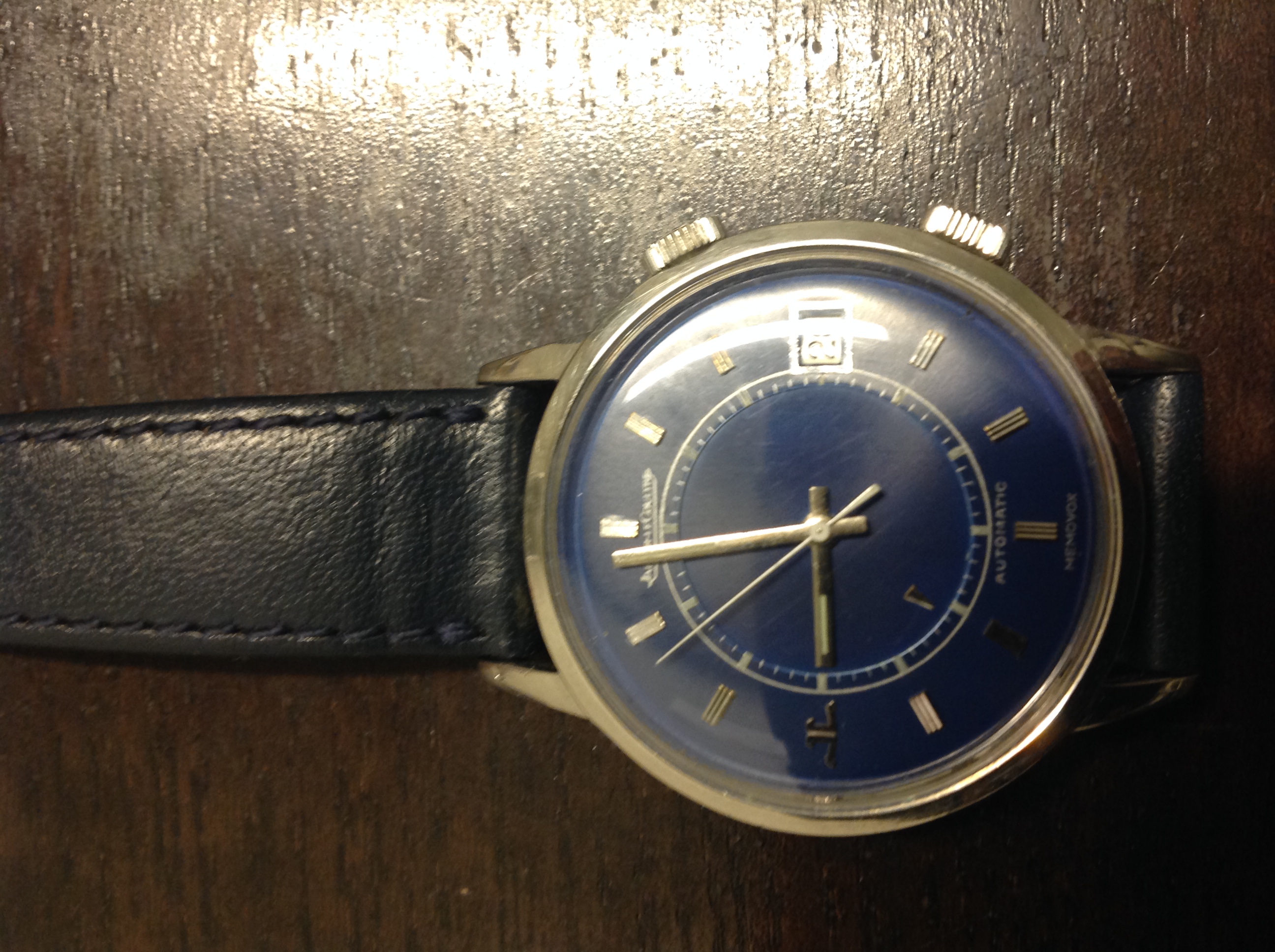 Blue dials outter and inner , second hand seems white (not sure if original). Two things that I am concerned about, I am not sure if it is far on the bottom, but there is no 'Swiss' or 'Swiss Made' written. I went to my local watch maker, who deals with vintage JLC and he opened the back and the movement is LeCoultre (unfortunately no pictures). I mentioned this to him and he said (in Swiss-German) something to extent of Jaeger & LeCoultre were separate but may have did different parts of a watch. I have read that the the text should match JLC dial, crowns, movement. Watch runs and keeps time (power reserve about 25-30 hours i guess) alarm works,not sure last time it was serviced. What do you think this may go for?