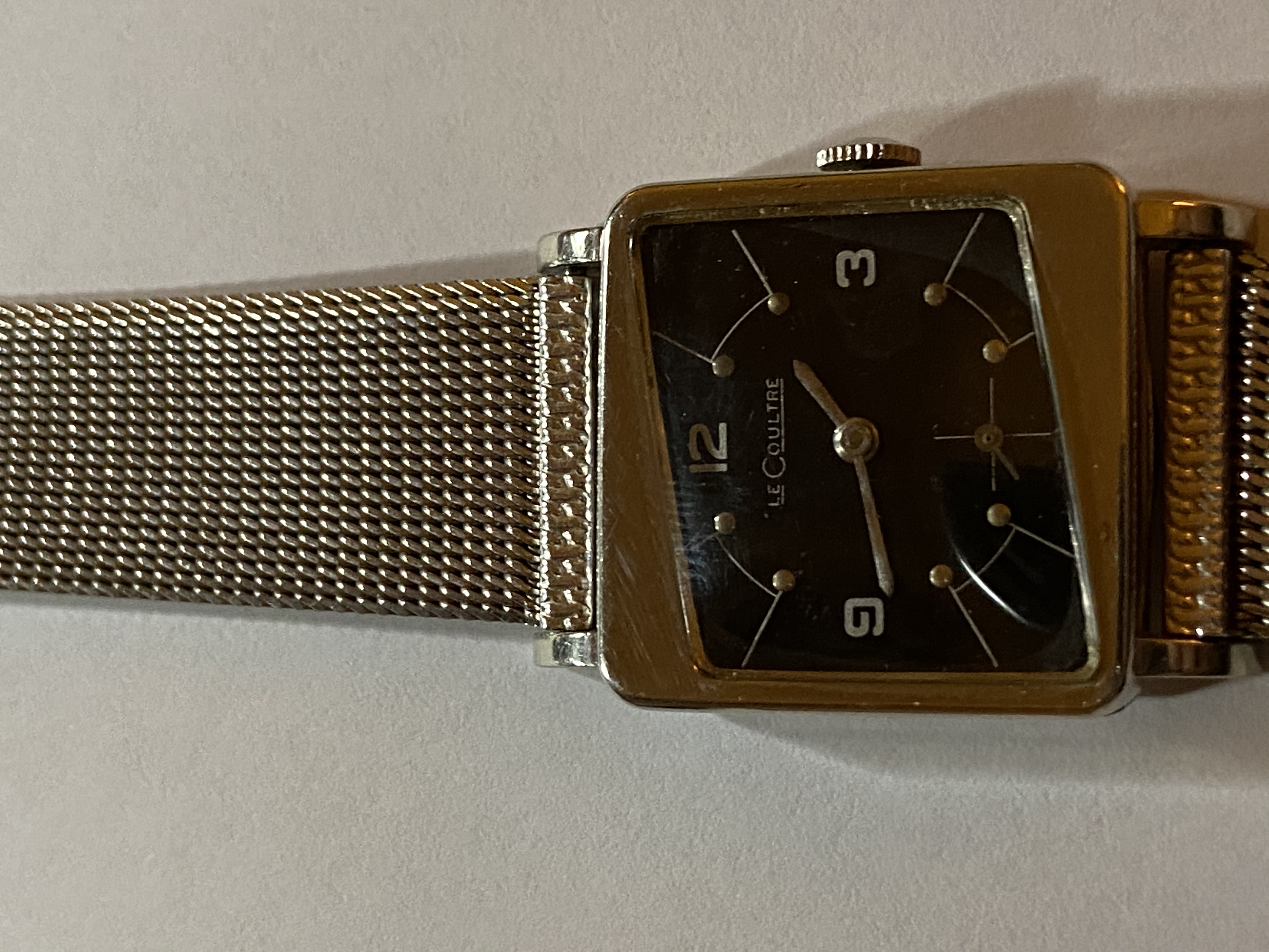 I picked up an unusual looking Le Coultre watch in a minute ex’s lot at auction. Really unusual slanted face/case cover.