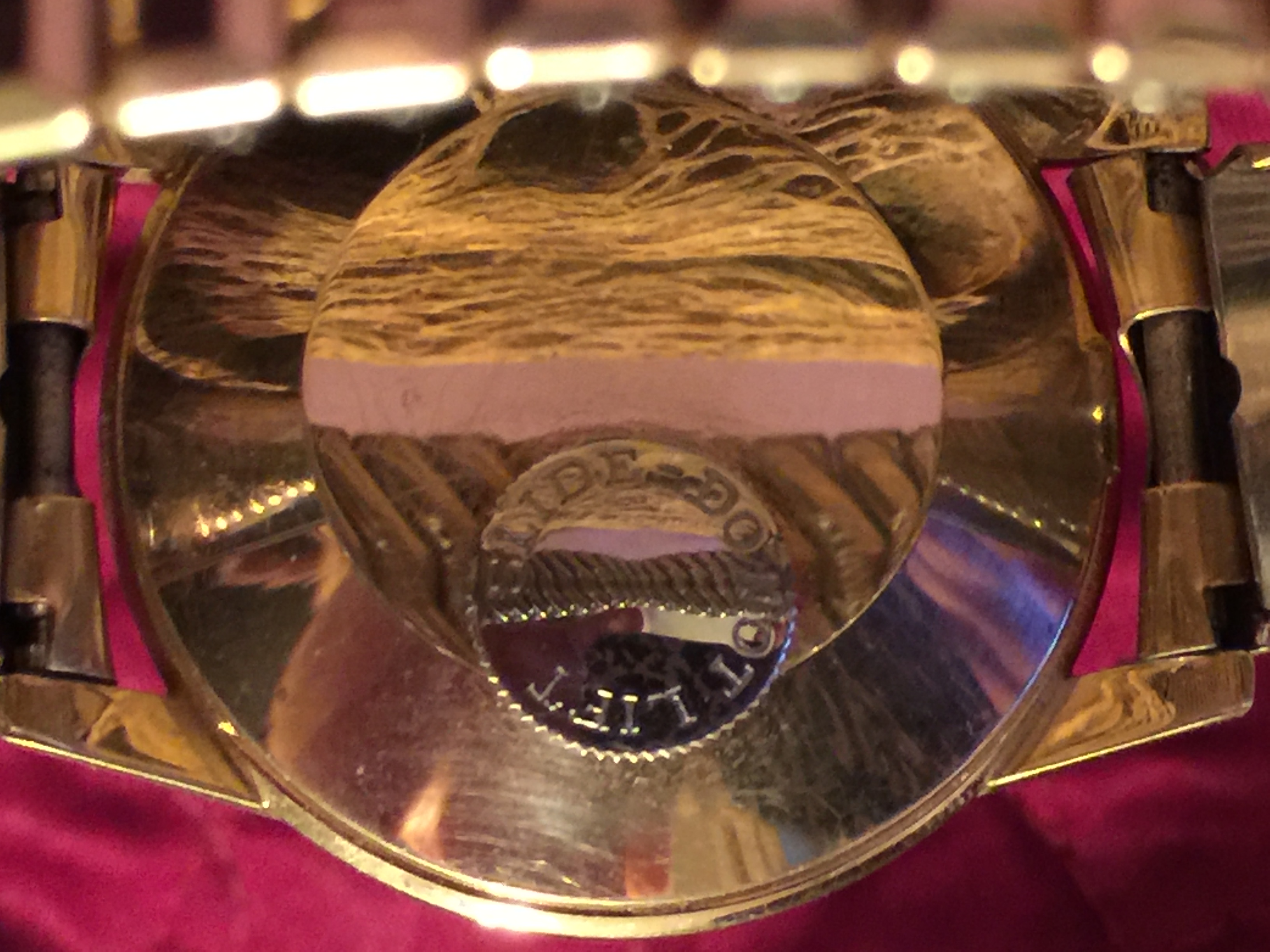 I finally got up enough courage to gently open the back of the watch. It is 10K gold filled. Here are some pictures. I will try to send a few more images including the one I meant to attach to my original post. I also can send a small video to show that the watch is running.