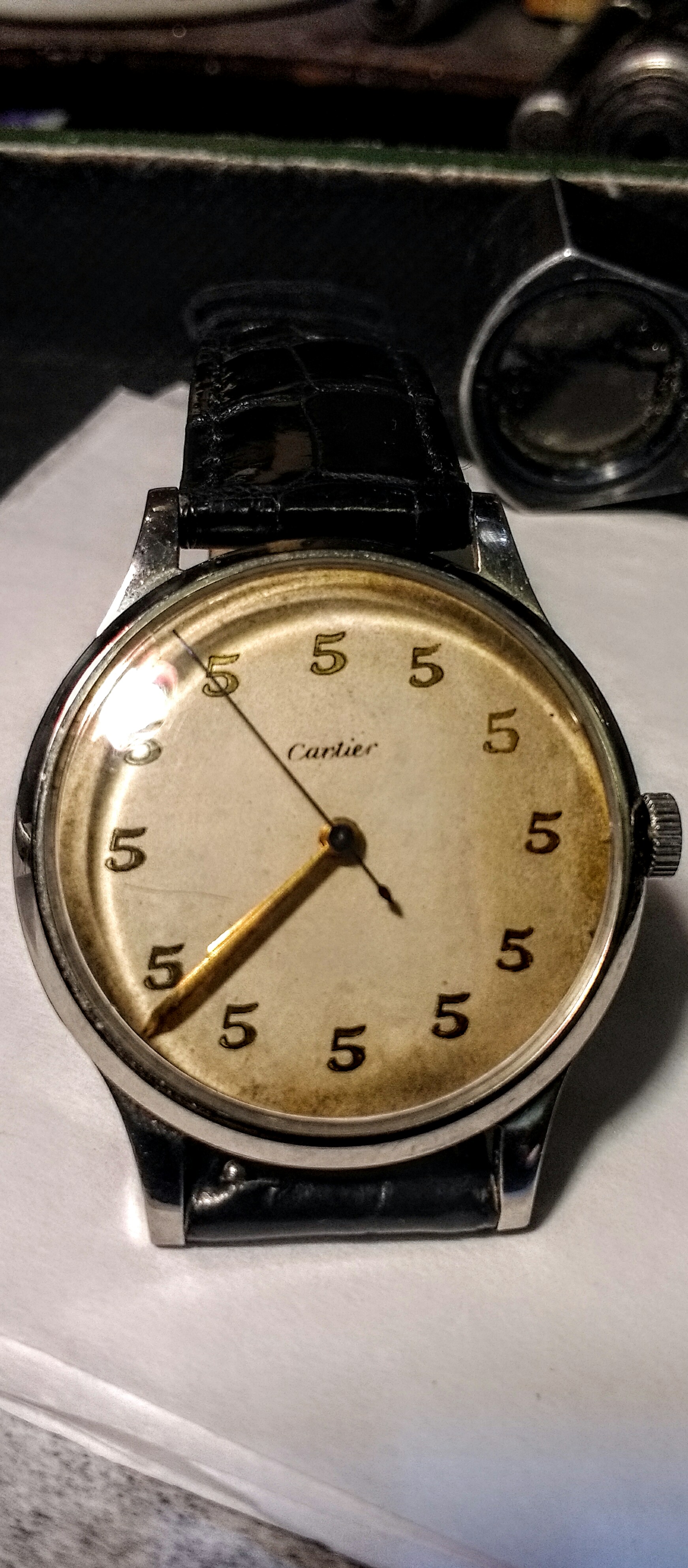 It it from the estate of a US bombedeer from WWII who was stationed in London after the war. My research has drawn a total blank as to the dial. The only data I have on Cartier novelty watches are related to the Crash model.